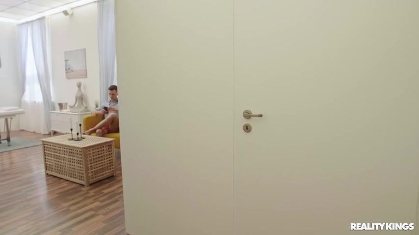 Lady Lyne comes to shoot a porn scene with Charlie Dean and he admires her big natural tits. Charlie suggests starting with a foreplay: he puts the girl on a massage couch and pours plenty of oil on her body and tits, after which they start fucking.