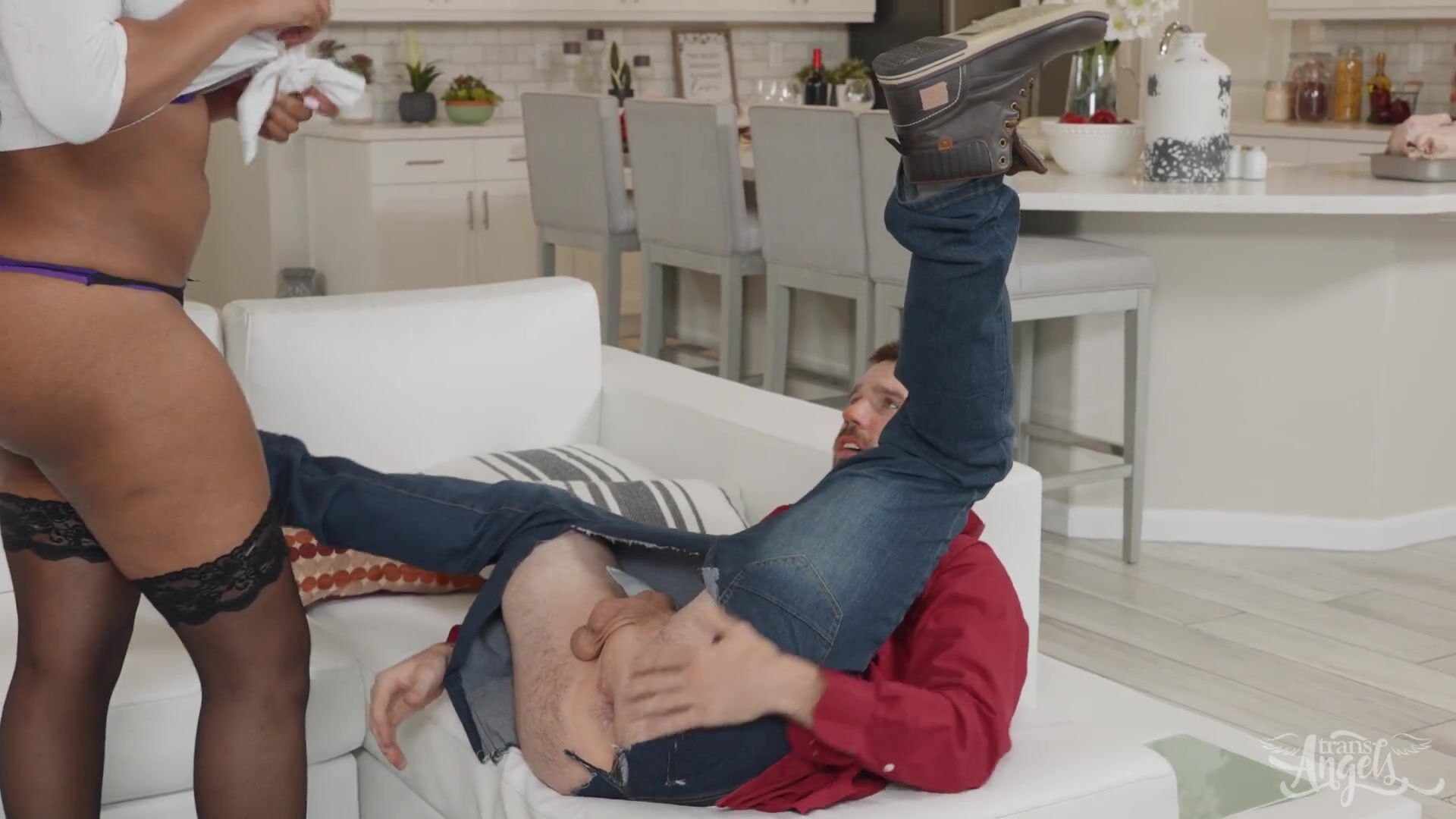 An exciting moment in the life of every girl (even a girl with a penis) is meeting her boyfriend's parents. For black trans beauty Jessica, this day coincided with Thanksgiving. After inviting them over, the black woman prepares a delicious dinner and greets Buck's parents with a big smile on her face. Everything seems to be going well, until the very moment when Buck Richards is left alone with Jessica. While the guy's parents are not around, the black trans makes him suck her dick and fucks him in the ass in the kitchen.